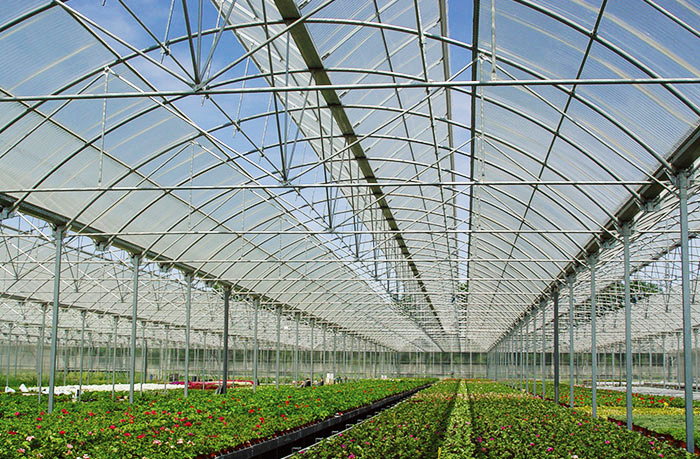 其在我處訂購的PC陽光板,采用德國原料譽(yù)耐8mm厚防霧滴陽光板,板材底面覆有一層抗冷凝處理的防霧滴層,具有自然的水?dāng)U散作用,使板材和冷凝水的表面張力大于空氣/水的表面張力,從而空氣中的水分在板材上均勻凝結(jié)成小水珠分布在板材上,沿著斜面(板材筋肋的方向)滑至邊緣,而并非直接滴落以達(dá)到防霧滴效果,防止溫室內(nèi)植物的損傷,同時(shí)改善溫室的透光率。